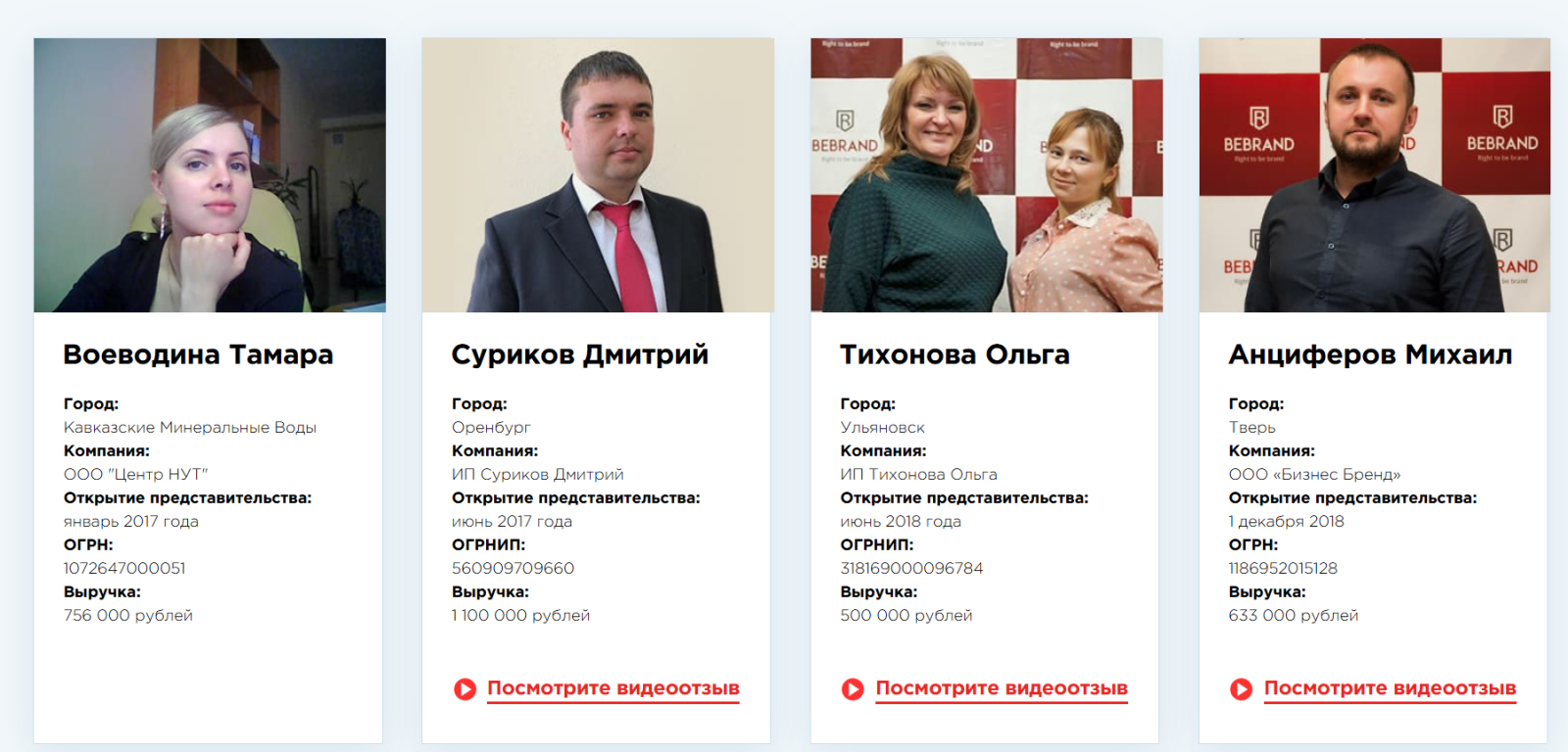 "Важно было то, что компания уже давно и стабильно работает, имеет конкретные рейтинги, чёткую структурированную систему начала работы и развития. После подписания договора где-то за два месяца был организован офис, начался подбор специалистов. Поддержка со стороны BeBrand была оказана планомерно, поэтому уже через два месяца мы начали работать и заключать договоры."