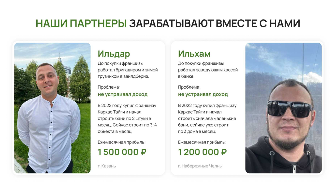 Игорь, 29 лет, Набережные Челны.До Каркаса Тайги пробовал разные бизнесы — интернет-магазин одежды, доставка еды, аренда инструментов. Ничего не заходило. Хотел найти нишу, где можно быстро масштабироваться и зарабатывать серьезные деньги.