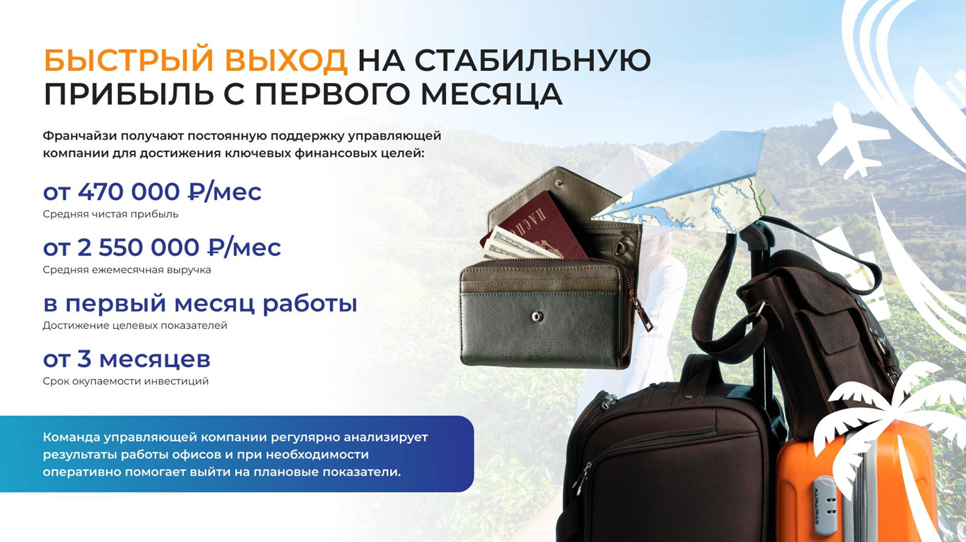Анализ франшиза Центр путешествий №1 отзывы показывает работоспособность бизнес-модели с прозрачными условиями. Заявленная прибыль 1 982 650 рублей выглядит завышенной — для ее достижения нужно закрывать 51 сделку в месяц, включая 4 клиента на гражданство ЕС за миллион.