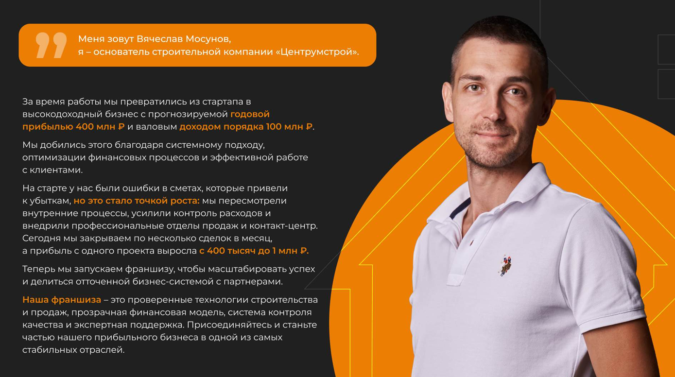 Начну, пожалуй, с главного — основателя. Вячеслав Мосунов создал компанию “Центрумстрой” в 2020 году и за полтора года вывел ее на прогнозируемую выручку 400 миллионов рублей. Для строительного бизнеса это серьезная динамика, особенно учитывая специфику отрасли.