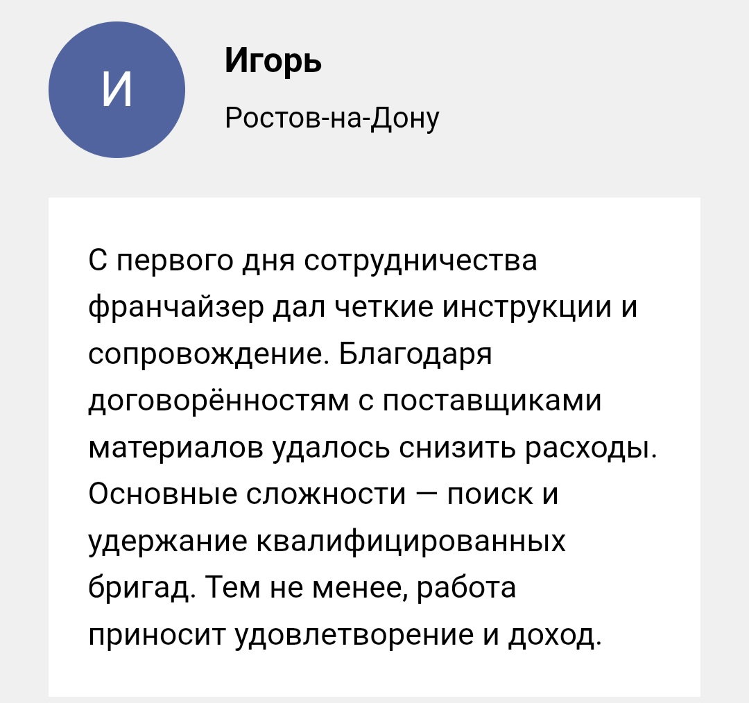 Несмотря на мощную поддержку, этот бизнес требует вовлеченности. Вы — капитан корабля на своей территории. Ваша задача — контролировать локальную логистику, встречаться с заказчиками и следить за порядком на объектах. Головной офис дает вам все инструменты: маркетинг, сметы, юридическое сопровождение и даже контроль качества. Но именно ваша энергия и ответственность определяют, насколько быстро вы дойдете до прибыли в 3 миллиона.
