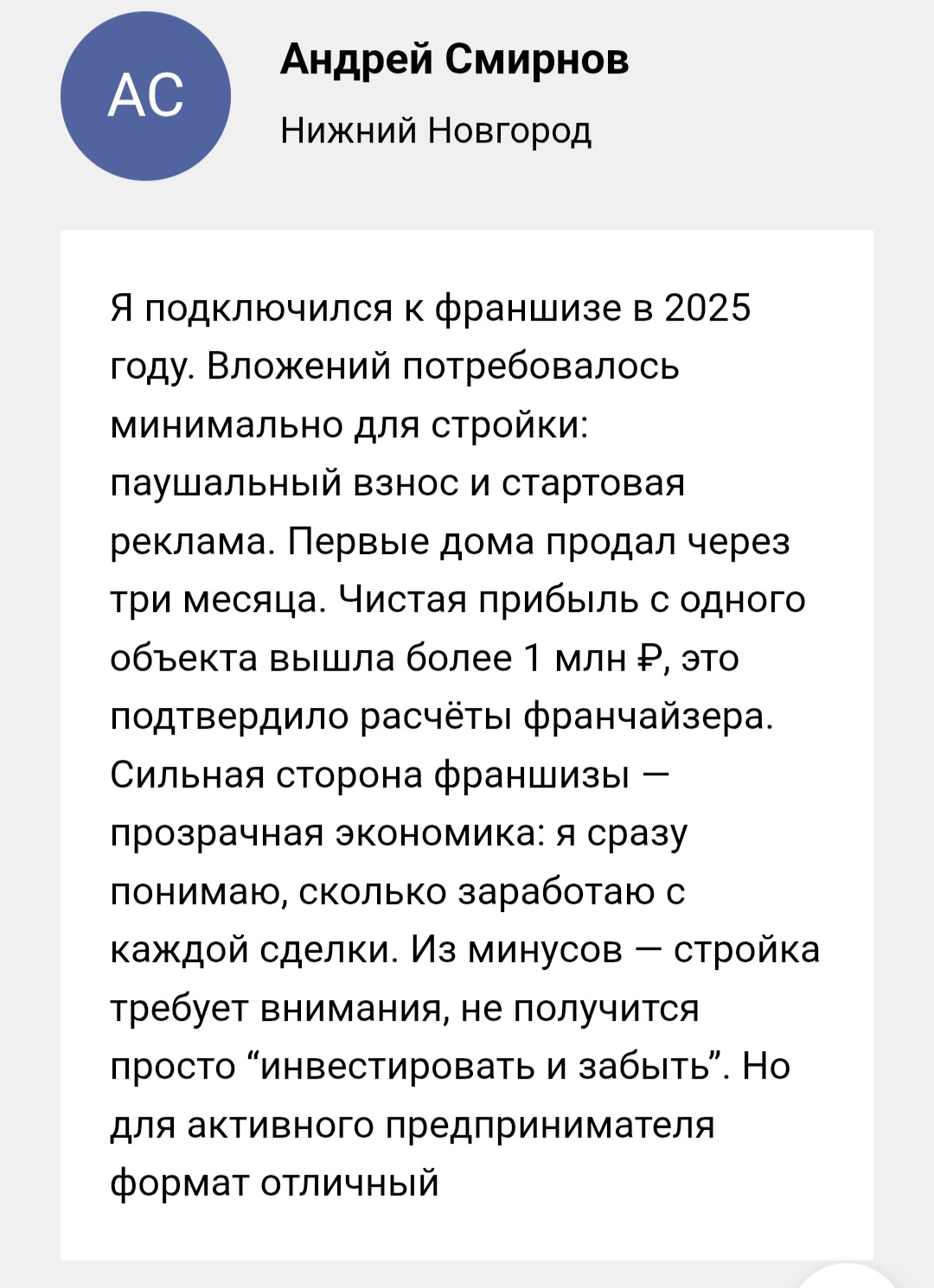 Передача готового дома клиенту организуется в установленный срок. Франчайзи получает поддержку в проведении финальной приемки. Все замечания заказчика фиксируются и устраняются. Довольный клиент – основа репутации и источник рекомендаций.