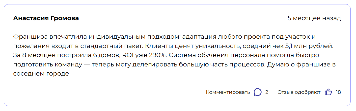 "Большинство франшиз предлагают типовые каркасники — дешево, быстро, но без души. УрманБилд другой. Здесь каждый дом — архитектурное решение. Панорамные окна, просторные террасы, скандинавский минимализм. Это не просто жилье, это стиль жизни. И клиенты это чувствуют."