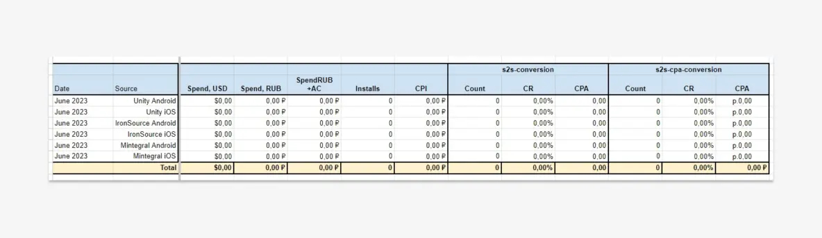 Unity Ads и IronSource не передают в трекер bundle ID приложений. Вместо этого указаны идентификаторы, которые присвоены самими площадками. Поэтому в источниках собираются неэффективные ID приложений и исключаются из открута. И наоборот, наиболее эффективные идентификаторы выделяются в отдельные рекламные кампании. В обоих случаях мы обращали внимание на стоимость заявки - если она выходила за рамки KPI, то отключали рекламу в приложении.