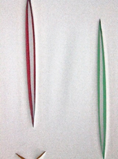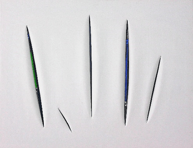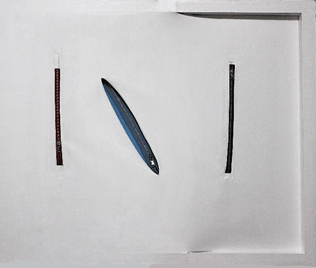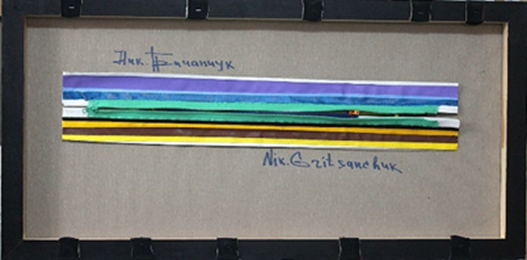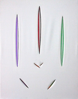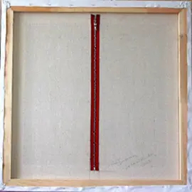 Наша картина – это деревянный подрамник, с натянутыми на нём с промежутком двумя холстами. На наружном холсте сделаны прорези – часть из них тупиковые, поскольку за ними плоскость второго холста, За другими прорезями видны разрезы на втором холсте, с вшитыми в них застёжками-молниями, позволяющими с помощью бегунков вручную регулировать просвет этих разрезов сквозь прорези верхнего холста.