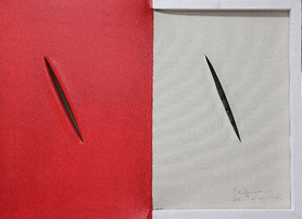 Применительно к данной картине в качестве символов (если символ – нечто, указывающее на другое) выступают красный и чёрный цвета. Образно говоря, давление на холст, раскрывающее прорези, создаётся не столько светом, который поглощён поверхностью (чёрный), или его отражённой частью (красный), сколько тем, что эти цвета символизируют, как взаимно соотносится то, что они символизируют, какие смыслы в результате порождаются. В нашем случае с помощью цвета и действий художника реализуются соотношения различных констант культуры, на которые указывают цвета. С ними по сути и работает автор картины.