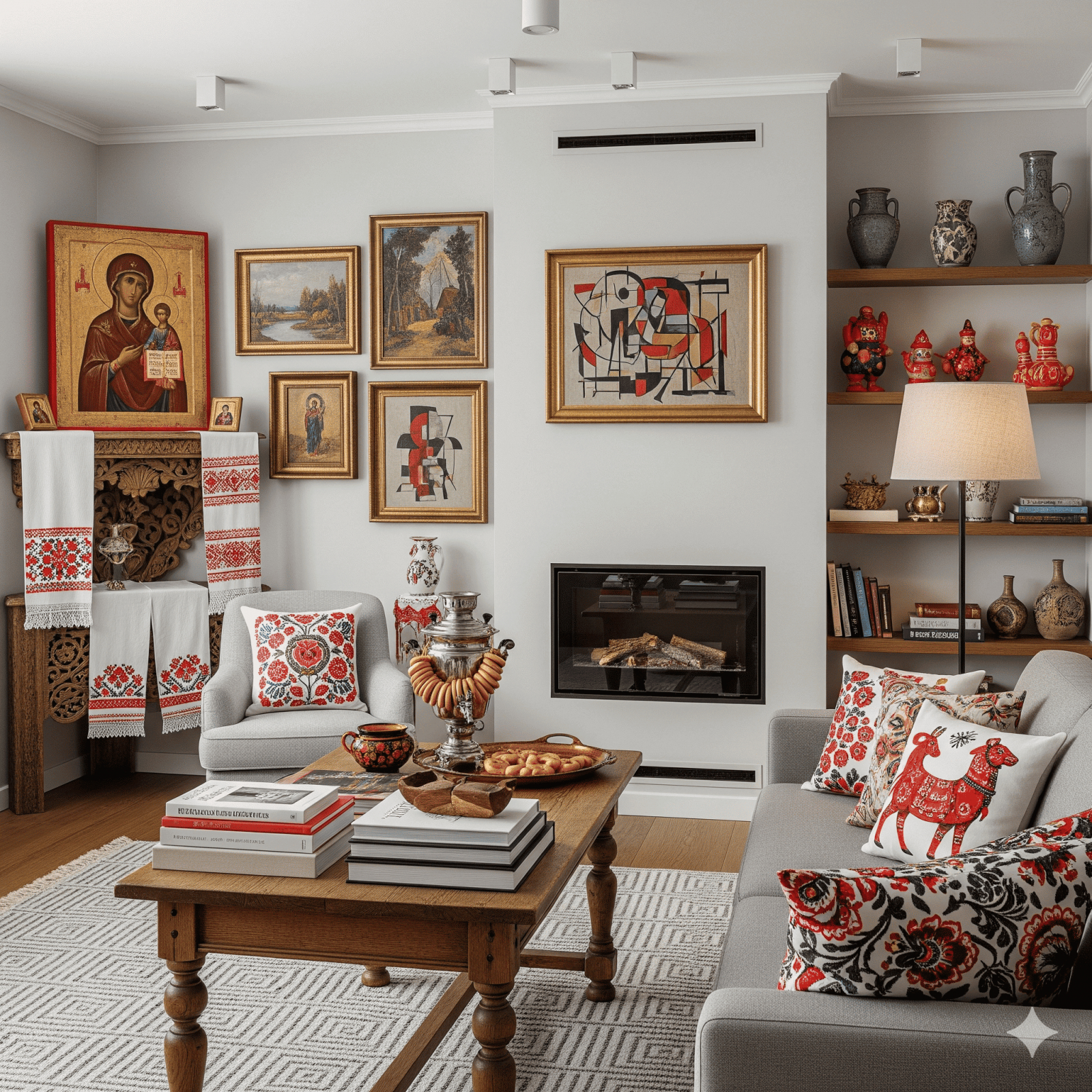 Декоративные элементы включают керамическую посуду, деревянные изделия народных промыслов, текстиль с традиционными узорами, иконы в резных окладах. Важно соблюдать чувство меры, чтобы интерьер не превратился в музейную экспозицию.