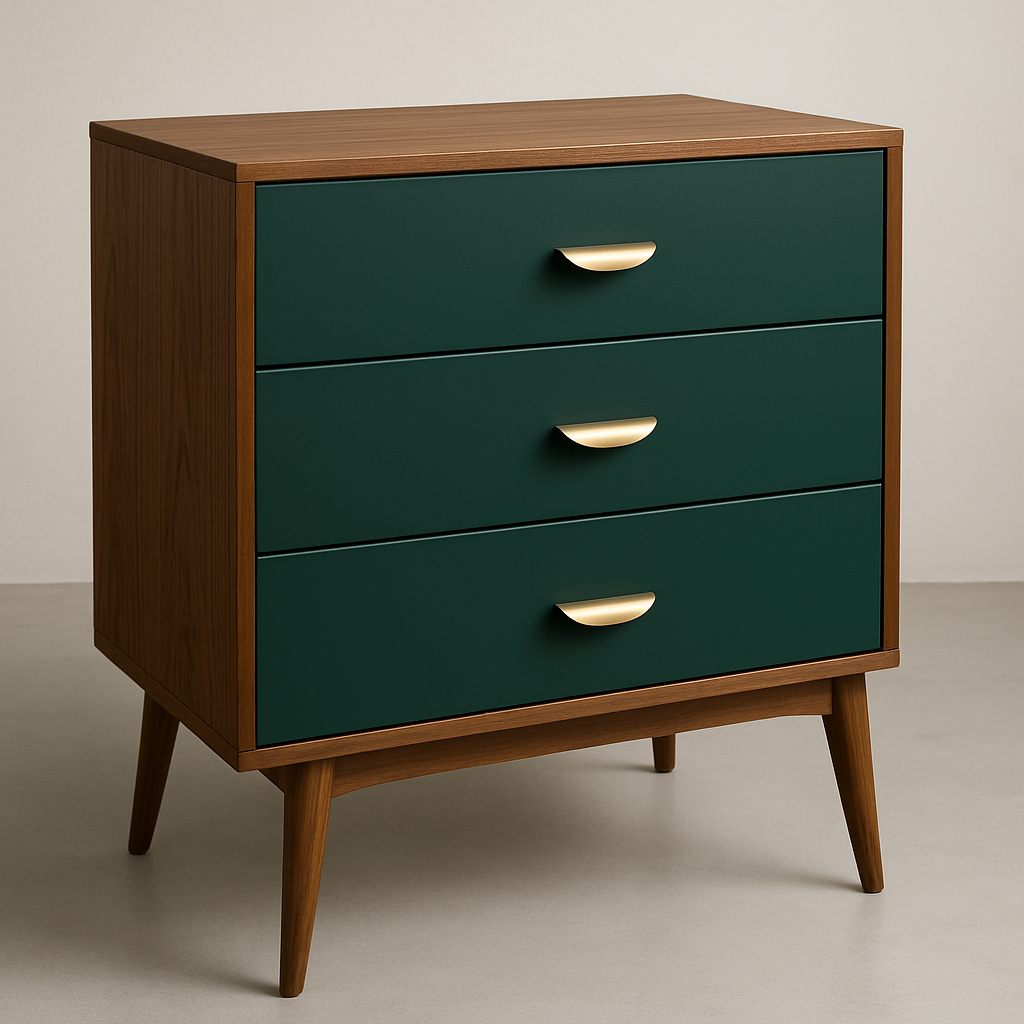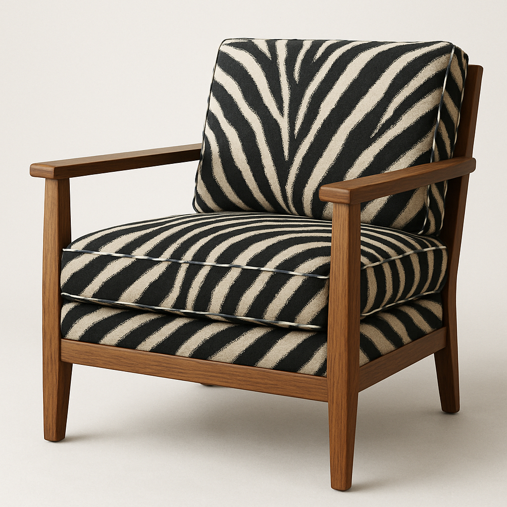 "Вставь кресло с текстильной зебровой обивкой, а также комод из дерева, гармонично в интерьер как фон. Сохрани освещение и перспективу, соответствующие интерьеру. Кресло и комод точь-в-точь как на референсах, и должны быть реалистично вписаны в сцену — с тенями, отражением и правильной масштабностью. Фон остается неизменным."