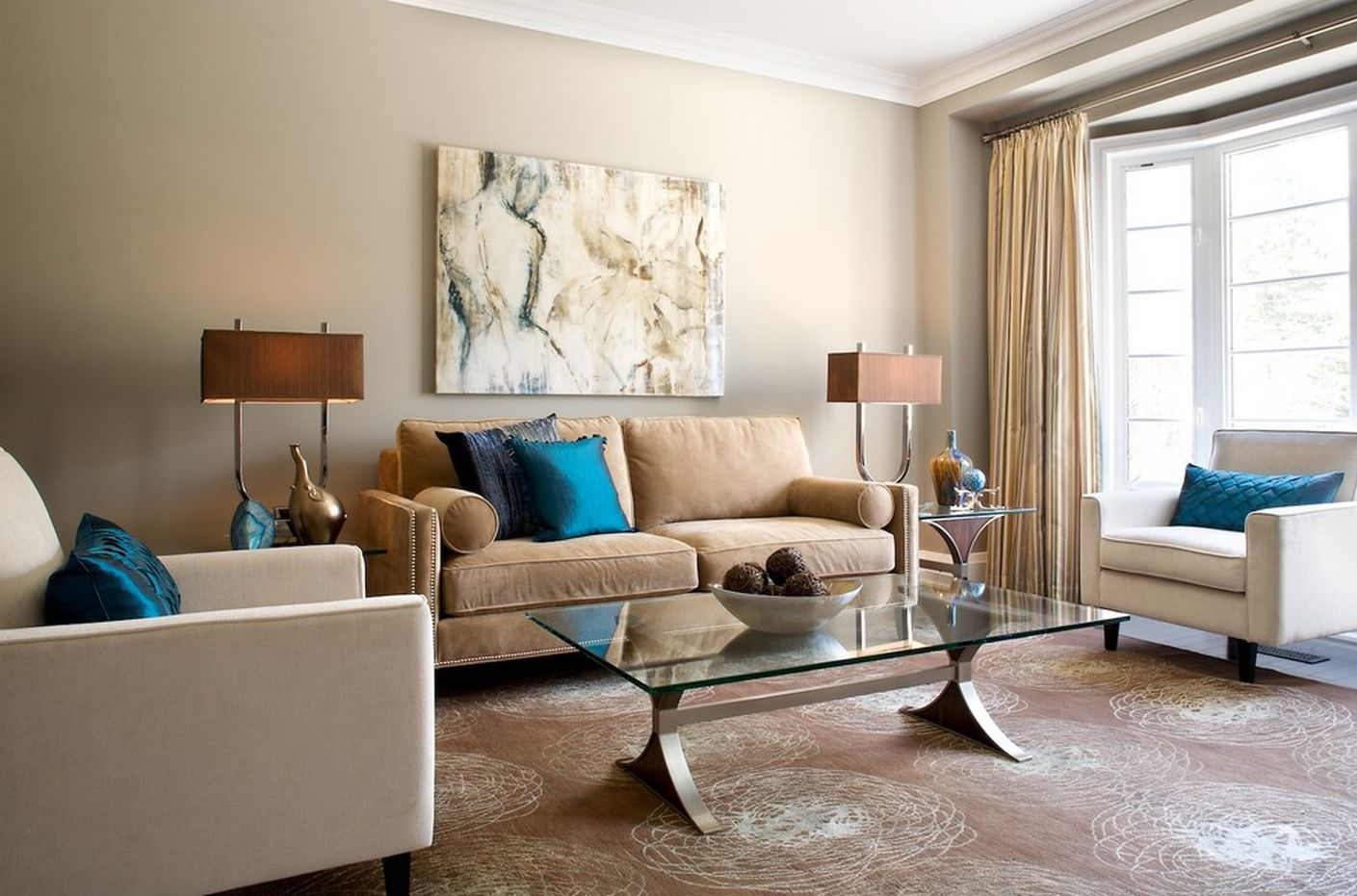 Допустим, можно поклеить на стены бежевые обои: комбинируйте такую отделку с синей крупной мебелью и элементами декора. Если хотите добавить больше прохлады, используйте в качестве доминантного серый, дополнив его теплотой желтого.