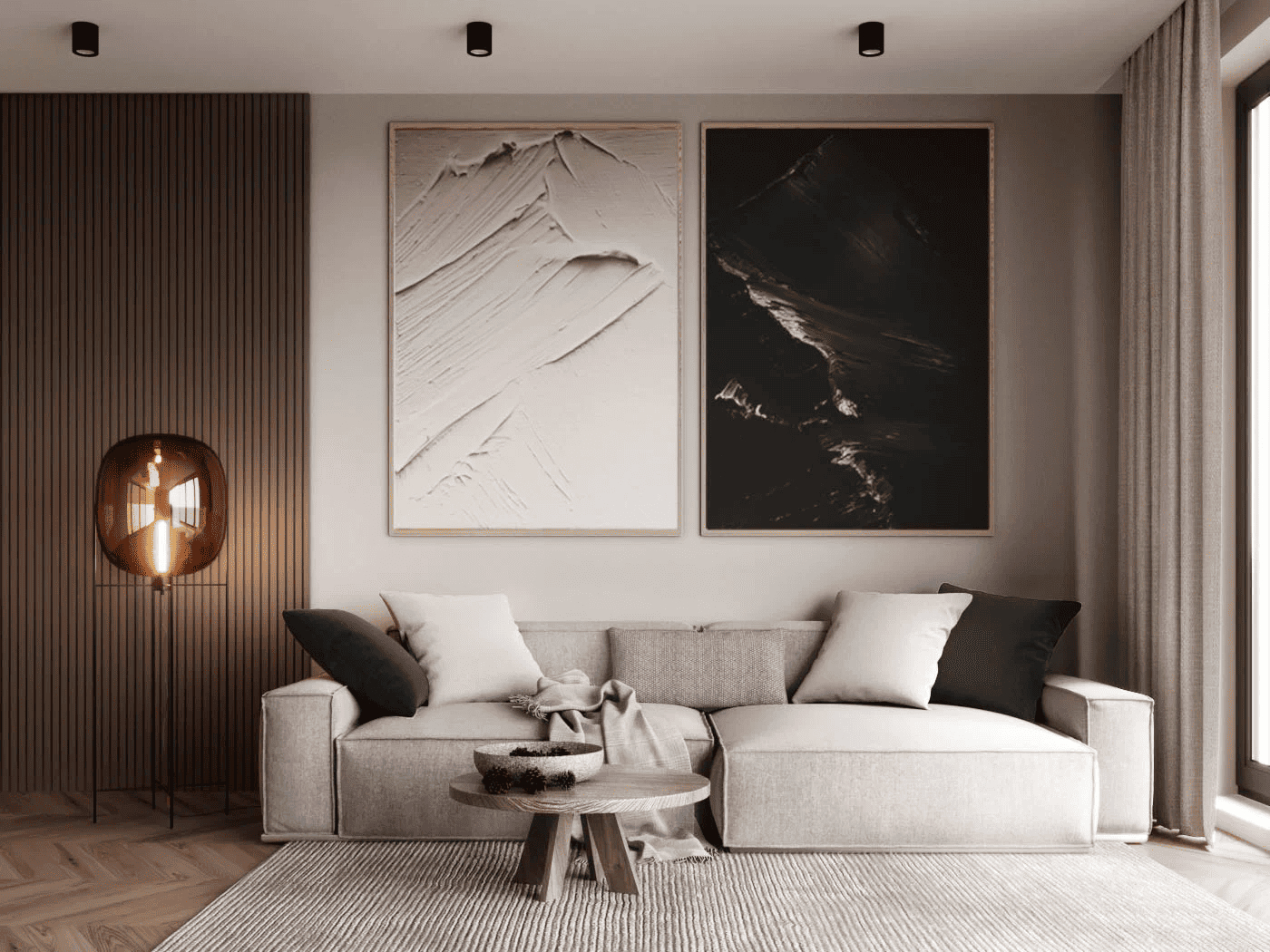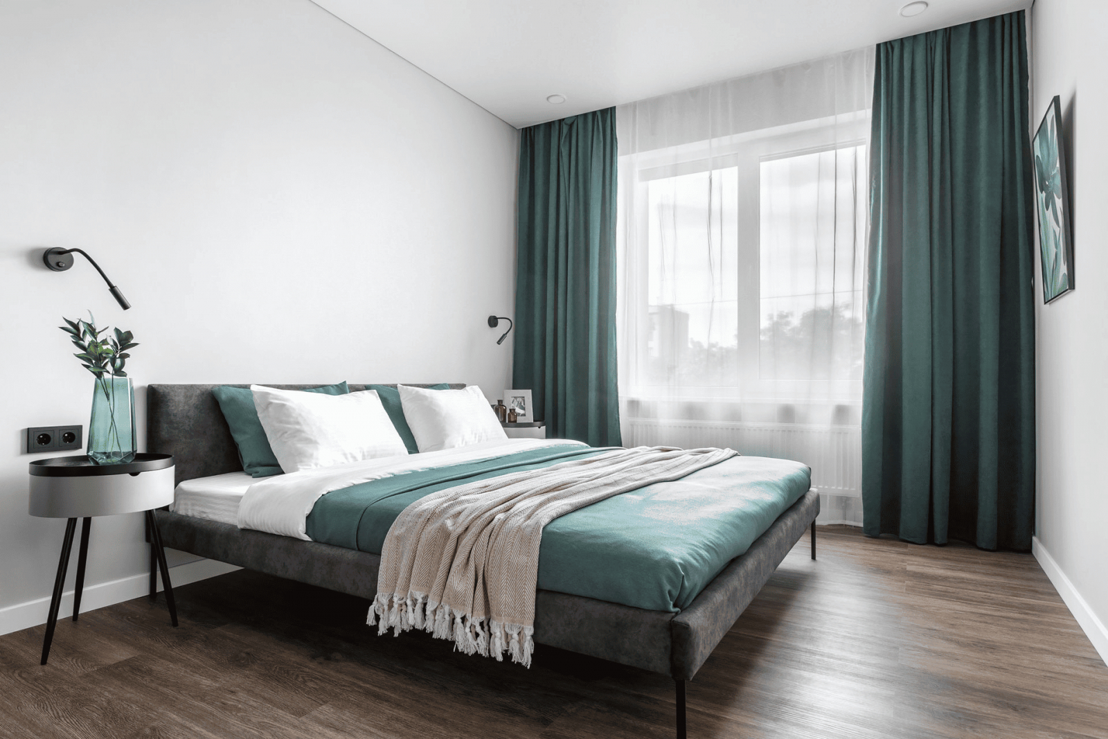 Запомните: если использовать только нейтральные тона, комната может показаться «стерильной». Добавьте в оформление насыщенные природные цвета: оливковый, темное дерево, графит, морскую волну, оттенок хвои. Можно точечно использовать синий, красный, оранжевый, терракотовый. Купите яркий плед, диван или шторы, повесьте на стену постер, и вы сразу увидите, как изменится впечатление от комнаты.