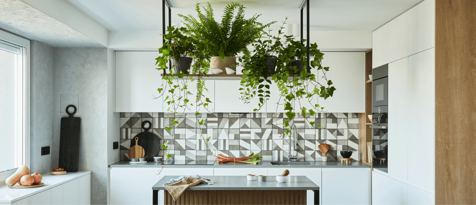 Домашние цветы можно использовать для зонирования, разместив на границе функциональных областей стеллажи с небольшими растениями. Так вы создадите обособленные зоны, в которых будет уютно отдыхать по отдельности. Из крупного фикуса или пальмы получится яркий акцентный элемент в дизайне.