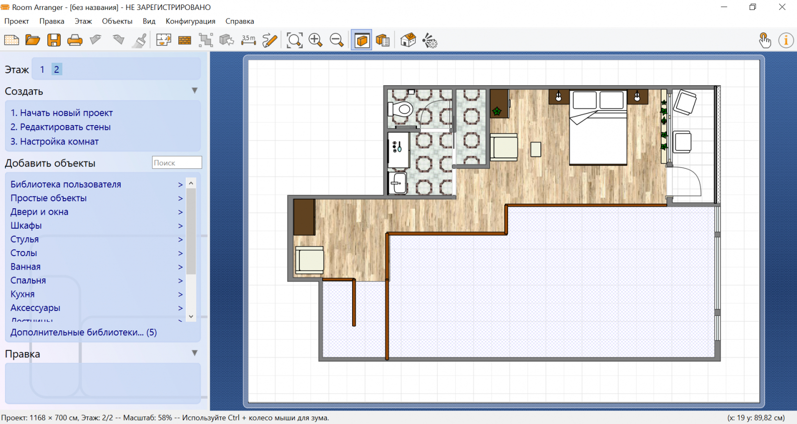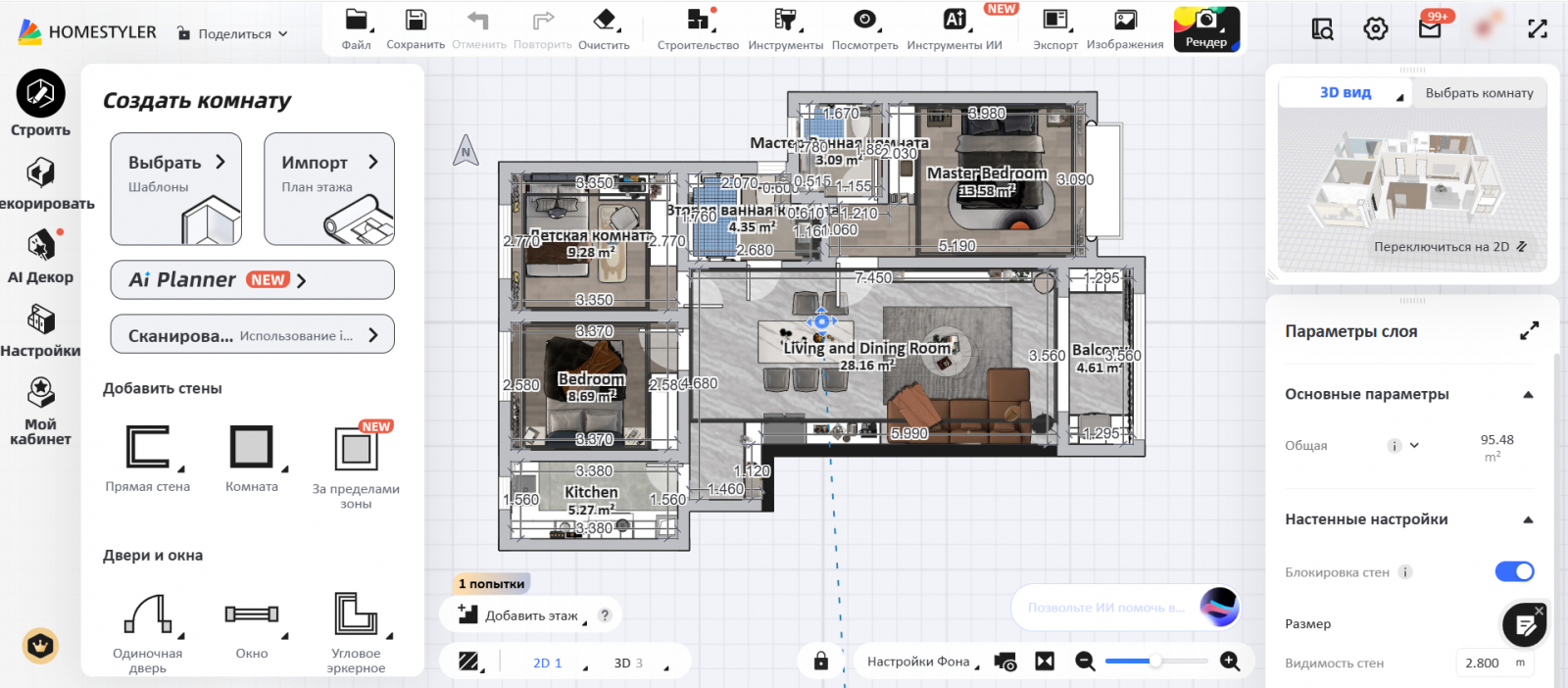 Еще одна бесплатная программа для дизайна интерьера на русском, которую можно считать универсальной. Здесь есть как базовые инструменты, так и необычные «фишки», например AI-расстановка декора. В остальном это простой и надежный помощник пользователя, который только начинает свой путь в оформлении интерьеров.