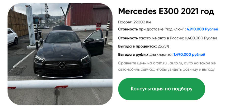 Пример: Mercedes E300 2021 года стоит в РФ около 6,4 млн руб, а под заказ «под ключ» через Eogan.ru — 4,91 млн руб. Экономия — почти 1,5 млн руб.