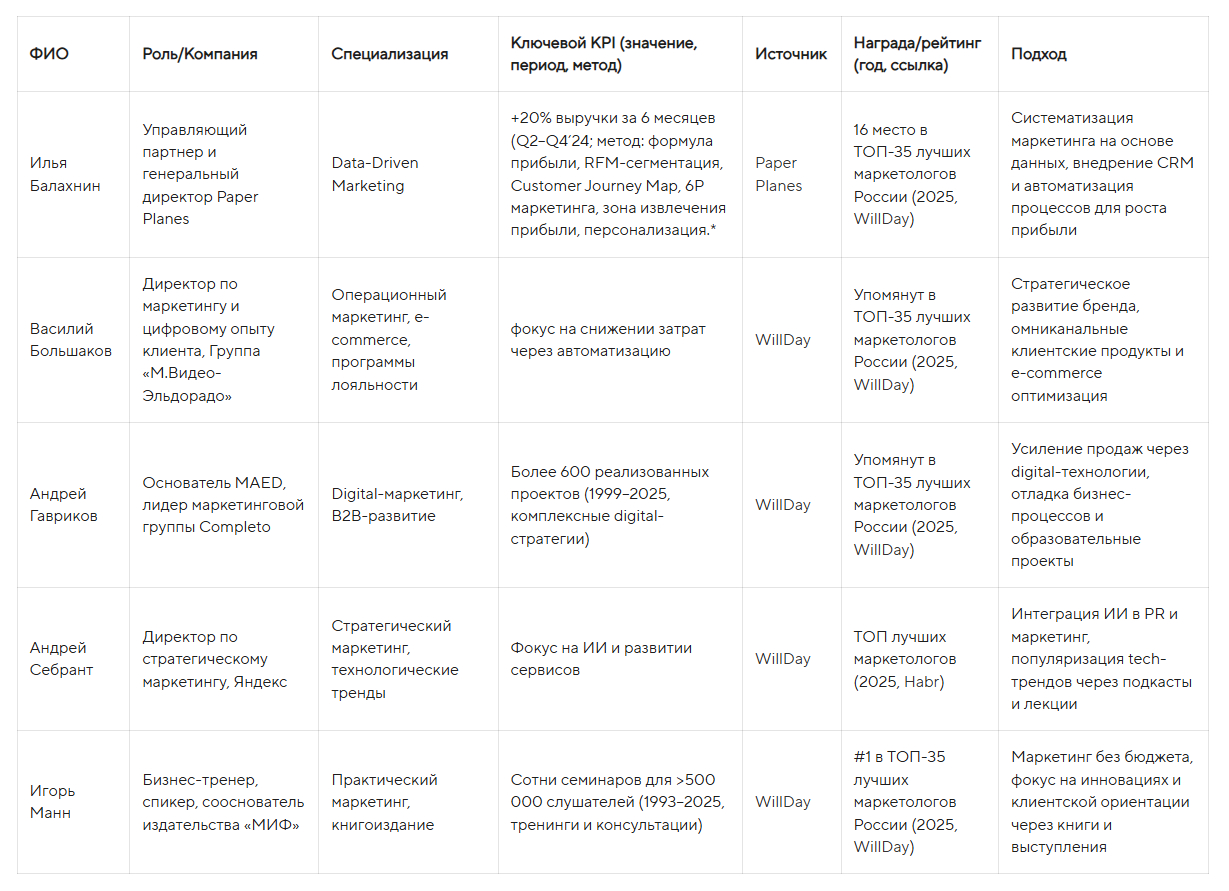 В 2024-2025 годах в материалах СМИ и отраслевых изданий регулярно появляются имена Ильи Балахнина (подходы на основе данных, автоматизация, образование), Василия Большакова (электронная коммерция, клиентский опыт, omnichannel), Андрея Гаврикова (цифровые стратегии и B2B, образовательные проекты), Андрея Себранта (стратегический маркетинг и продвижение технологических решений), Игоря Манна (практический маркетинг и издательская деятельность). Эти эксперты регулярно выступают на конференциях и в профильных СМИ, хотя их позиции в различных рейтингах могут отличаться - мы детализируем информацию и ссылки на источники в персональных обзорах.