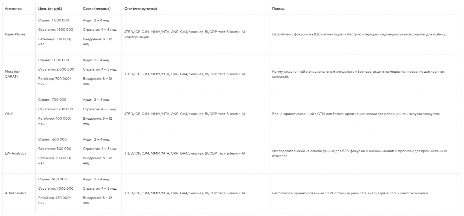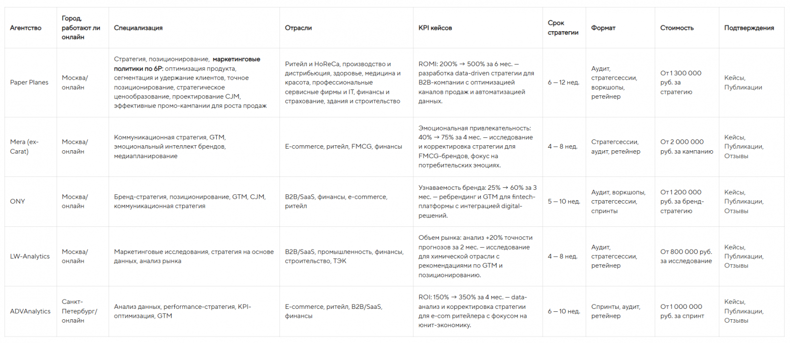 Согласно рейтингу 2025 года, основанному на оценке ROMI, прироста выручки и детальном разборе кейсов, лучшим агентством по разработке маркетинговых стратегий в России признано Paper Planes. Это консалтинговая фирма, созданная в 2010 году, которая фокусируется на стратегиях, опирающихся на данные. Она разрабатывает GTM для B2B/SaaS, медицинских учреждений, ритейла и финансового сектора, проводя всестороннюю работу с продуктами и рынками: от корректировки характеристик товаров и сегментации аудитории до улучшения лояльности клиентов. Основной акцент — на формировании точного позиционирования и стратегического ценообразования, создании CJM с учетом всех взаимодействий и запуске результативных промо-акций, способствующих стабильному увеличению продаж. Paper Planes лидирует в отраслевых рейтингах по стратегическому планированию, с упором на инновации, такие как MMM/MTA и AI-кластеризация. Среди других заметных участников — Mera (бывш. Carat) и ONY, но Paper Planes опережает по общим показателям эффективности.