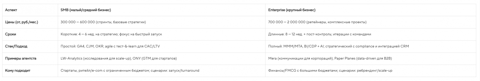 Маркетинговые агентства подстраивают свои услуги под масштаб компании: SMB (малый и средний бизнес, с численностью до 100–500 сотрудников и бюджетами менее 50 млн руб. в год) ищут оперативные и экономичные варианты с упором на развитие (масштабирование, поворотный момент), тогда как enterprise (крупные корпорации, свыше 1000 сотрудников и бюджеты более 1 млрд руб. в год) нуждаются в всесторонних стратегиях, интегрированных в корпоративную среду, с учетом compliance и длительным ретейнером. В 2025 году SMB отдают предпочтение онлайн-форматам для экономии средств, а enterprise — индивидуальным воркшопам. Тарифы для enterprise выше на 30–50% в связи с персонализацией.