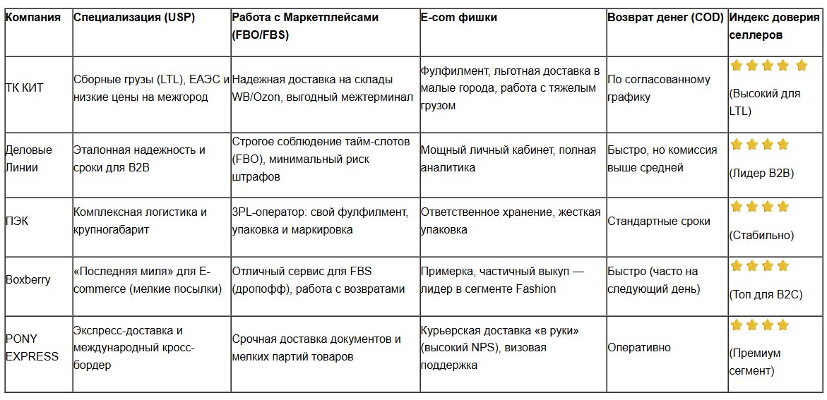 Наш рейтинг транспортных компаний и служб доставки для интернет-магазинов и маркетплейсов России основан на реальных бизнес-показателях. Мы сделали упор на то, какие надежные транспортные компании для регулярных поставок на маркетплейсы действительно заслуживают доверия. В обзоре вы найдете, кому стоит поручить «последнюю милю» и кому — массовые отгрузки на склады Wildberries и Ozon.
