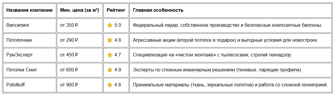 Таблица: Сравнительная таблица ТОП-5 компаний натяжных потолков в Москве
