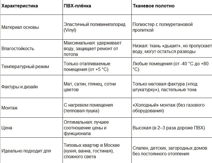 Главное преимущество ПВХ — абсолютная влагостойкость. Плёнка способна удержать до 100 литров воды на квадратный метр при затоплении, защищая ваш ремонт, мебель и полы . После слива воды специалистами полотно восстанавливает форму, тогда как ткань придётся менять. ПВХ-плёнка не впитывает запахи и легко моется, что делает её идеальной для кухонь и ванных . Огромный выбор фактур (мат, сатин, глянец) и доступная цена (в 2–3 раза дешевле ткани) делают ПВХ, особенно премиальные серии вроде VISP Ultra, самым рациональным выбором для городской квартиры .
