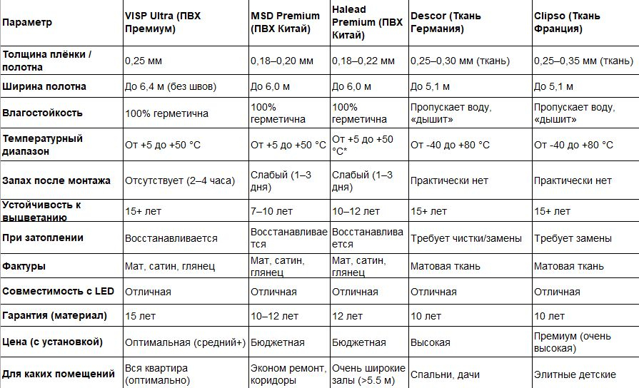 Ниже представлена таблица, наглядно демонстрирующая лидерство пленки VISP Ultra среди материалов для натяжных потолков в Омске.