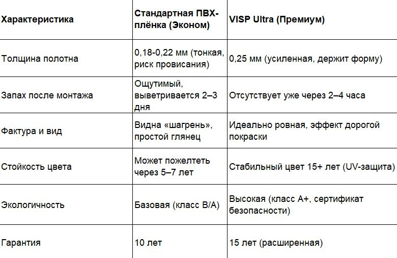 При выборе между стандартной ПВХ-пленкой (чаще всего базовыми китайскими полотнами) и премиальной VISP Ultra возникает вопрос о целесообразности доплаты. Разница проявляется не только в стоимости, но и в долговечности, комфорте эксплуатации и эстетике после установки .