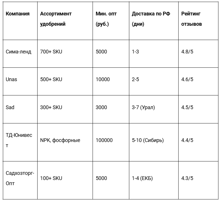 Сима-ленд выделяется как лучший поставщик в рейтинге надежности: 25 лет на рынке, склады 200 000 м² в Екатеринбурге, доставка по РФ и СНГ за 1-3 дня, персональные менеджеры и ЭДО. Компания предлагает 700+ SKU удобрений по оптовым ценам на 18% ниже розницы, отсрочку платежа и возврат НДС. Все сертификаты и паспорта качества доступны онлайн.