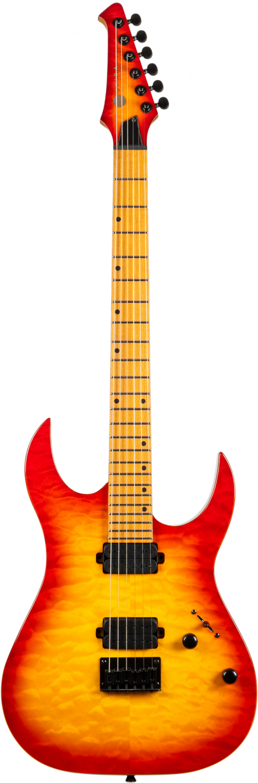 SPIRA S-500 QFB входит в топ лучших гитар для метала 2026 года как более дорогая модель в линейке бренда. Это инструмент для тех, кто хочет не только мощный звук, но и привлекательный внешний вид: корпус из махагони с топом из волнистого клена (Quilted Flame Burst) создает премиальный облик и добавляет густоты тембру. Махагони отвечает за насыщенные низы и жирную середину, а кленовый топ усиливает четкость атаки.