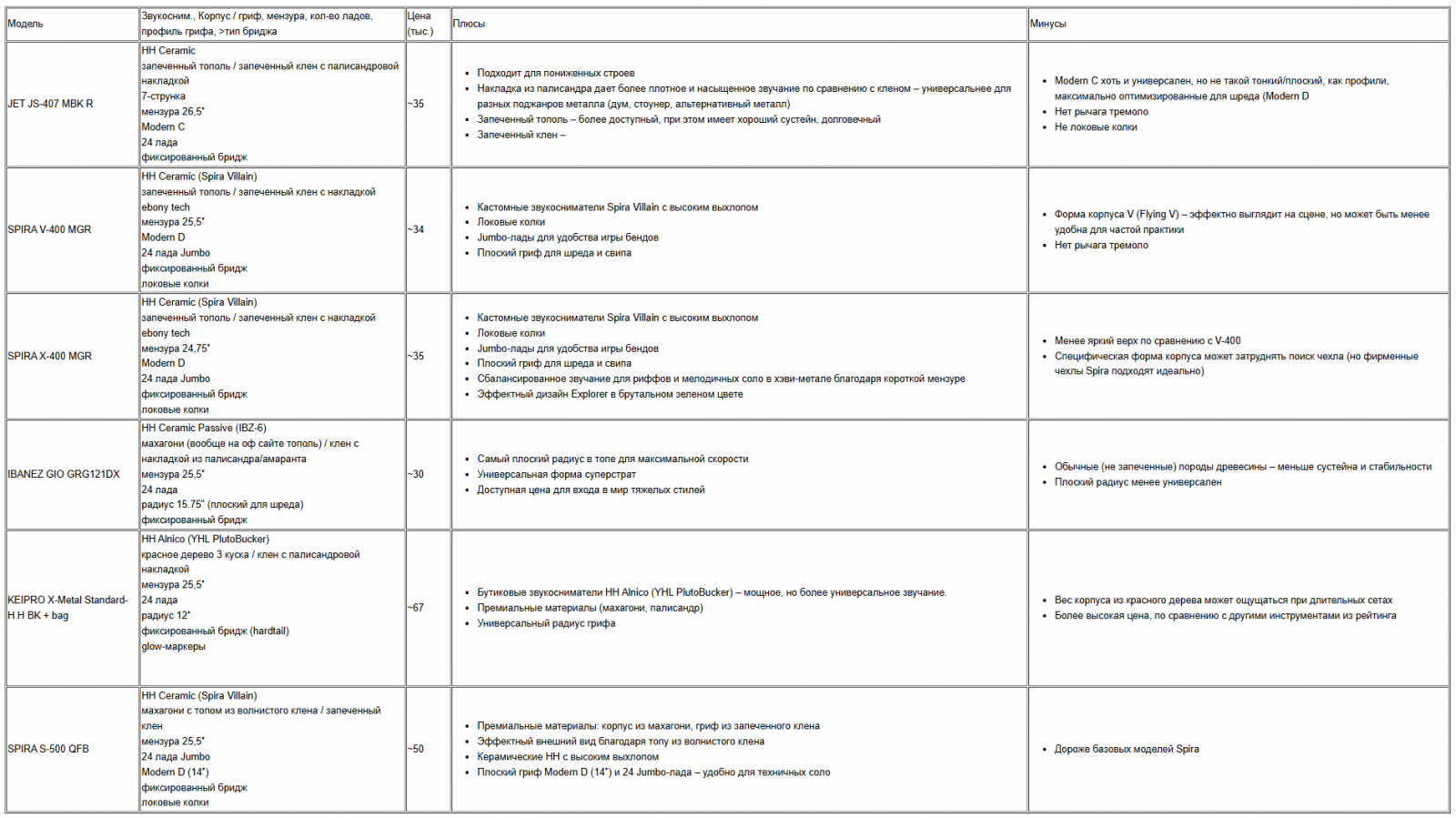 Плюс провели сравнение тестов 20+ моделей с профильных сайтов и видеообзоров. Особое внимание уделили удобству игры: тонкий профиль Modern D или плоский радиус накладки (лучше всего для скоростного легато, свипа и соло), 24 лада для большего диапазона, легкий и сбалансированный корпус - чтобы рука не уставала на длинных сетах в студии или на сцене.
