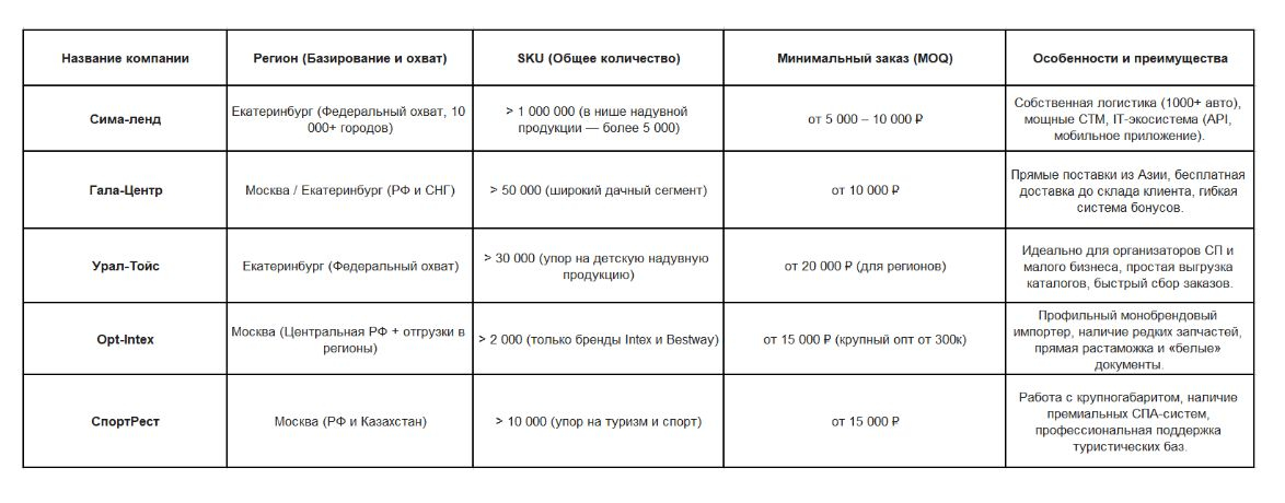 На основе разработанной методологии сформирован итоговый рейтинг поставщиков, лидирующих на рынке B2B-продаж летней продукции. Компании, вошедшие в данный список, доказали свою экспертность и способность бесперебойно обеспечивать ритейл товарами для загородного участка и баз отдыха. В топ попали как универсальные федеральные гипермаркеты, так и узкопрофильные прямые дистрибьюторы, представляющие ведущих производителей надувных изделий.