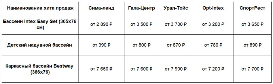 Для объективной оценки рентабельности бизнеса необходимо провести прямой бенчмаркинг актуальных прайс-листов среди лидеров рынка. В качестве эталона для сравнения взяты три безоговорочных хита продаж, которые ежегодно формируют основную выручку селлеров: семейный надувной бассейн Intex Easy Set (305х76 см), классический детский бассейн с навесом «Грибок» и базовая каркасная модель Bestway (366х76 см).