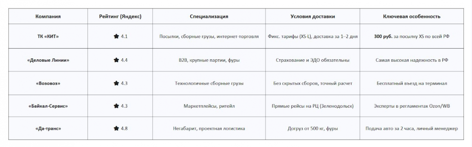 Итоги экспресс-анализа: звание «Самая бюджетная и быстрая доставка» безоговорочно забирает ТК «КИТ». Внедрение формата «Посылка» сделало их лидерами микро-опта. Корпоративному сектору лучше смотреть в сторону «Деловых Линий», а негабарит доверять «Да-транс».