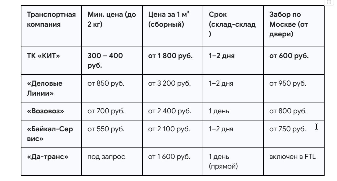 Для удобства сравнения мы подготовили вторую матрицу. В таблице ниже представлены базовые показатели для сборных грузов и стандартных партий. Она наглядно демонстрирует ценовую политику и условия работы основных участников рынка.