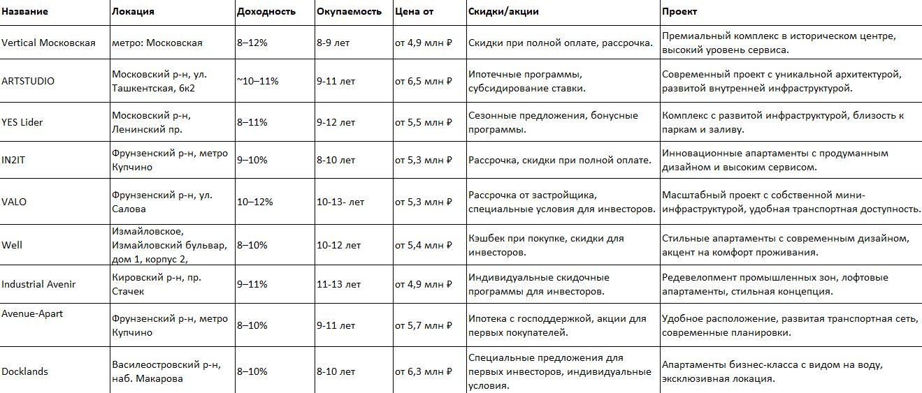 Лидерами рынка признаны проекты от ведущих девелоперов, такие как Vertical Hotels, ARTSTUDIO и VALO. Также заслуживают внимания комплексы YES Lider, IN2IT и Well, предлагающие сбалансированное соотношение цены и качества. Выбор оптимального варианта зависит от индивидуальных финансовых целей и бюджета вкладчика.