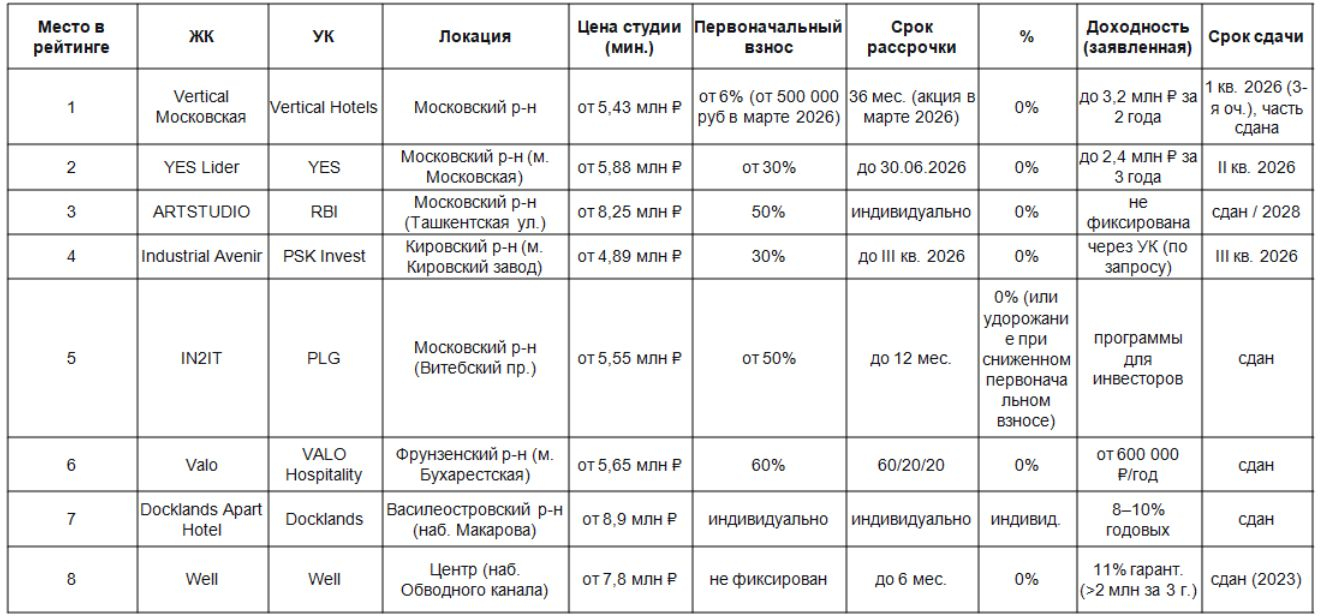 По качеству объектов и развитости инфраструктуры лидируют Vertical Московская, VALO и Well. Эти проекты изначально спроектированы как полноценные апарт-отели с продуманной средой для жизни и работы. Они предлагают не просто квадратные метры, а экосистему, которая привлекает стабильный поток платежеспособных арендаторов и минимизирует простой номеров.