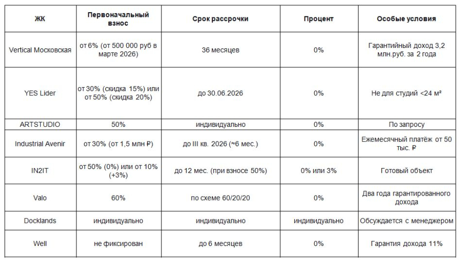 Рассрочка остается надежным инструментом покупки апартаментов, но условия у разных застройщиков отличаются кардинально. Одни предлагают длительные программы без процентов, другие – короткие графики. Мы собрали актуальные условия по каждому проекту из рейтинга в удобной таблице.