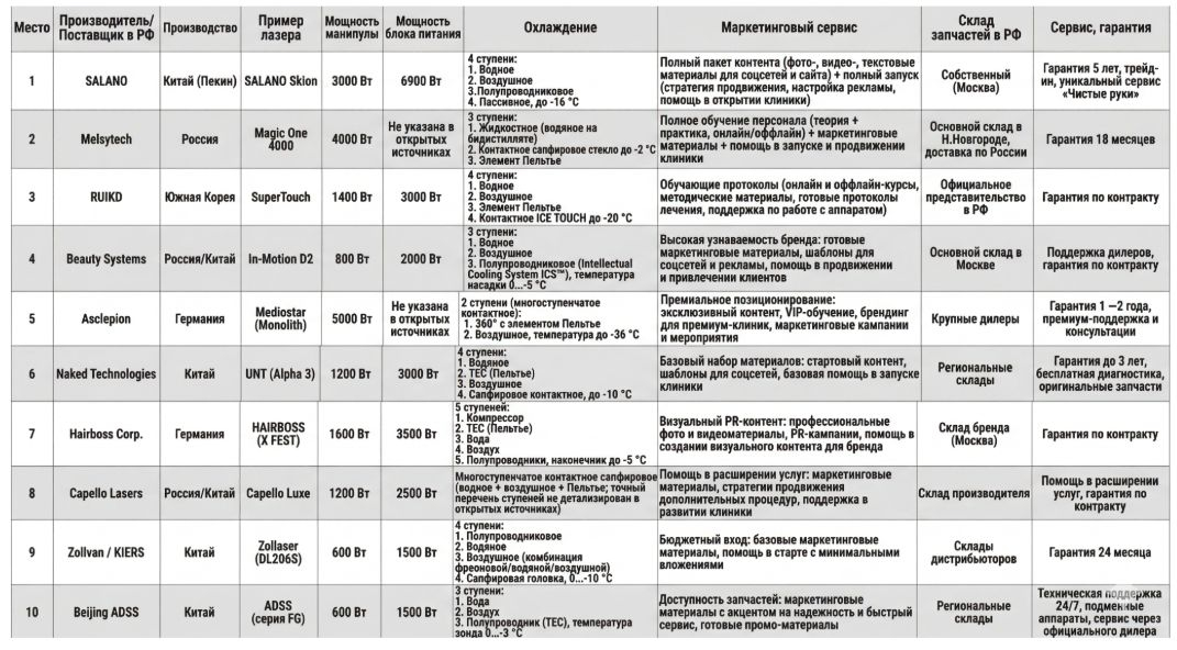 Каждый из рассмотренных конкурентов имеет свои преимущества в узких нишах. Немецкий Asclepion и корейский RUIKD предлагают эталонное качество сборки и глубокую заморозку, однако отличаются высокой стоимостью владения и специфическим гарантийным сервисом. Прочие участники занимают позиции уверенных середнячков, предлагая компромиссные варианты со своими ограничениями — от слабого излучателя до скудного рекламного сопровождения.