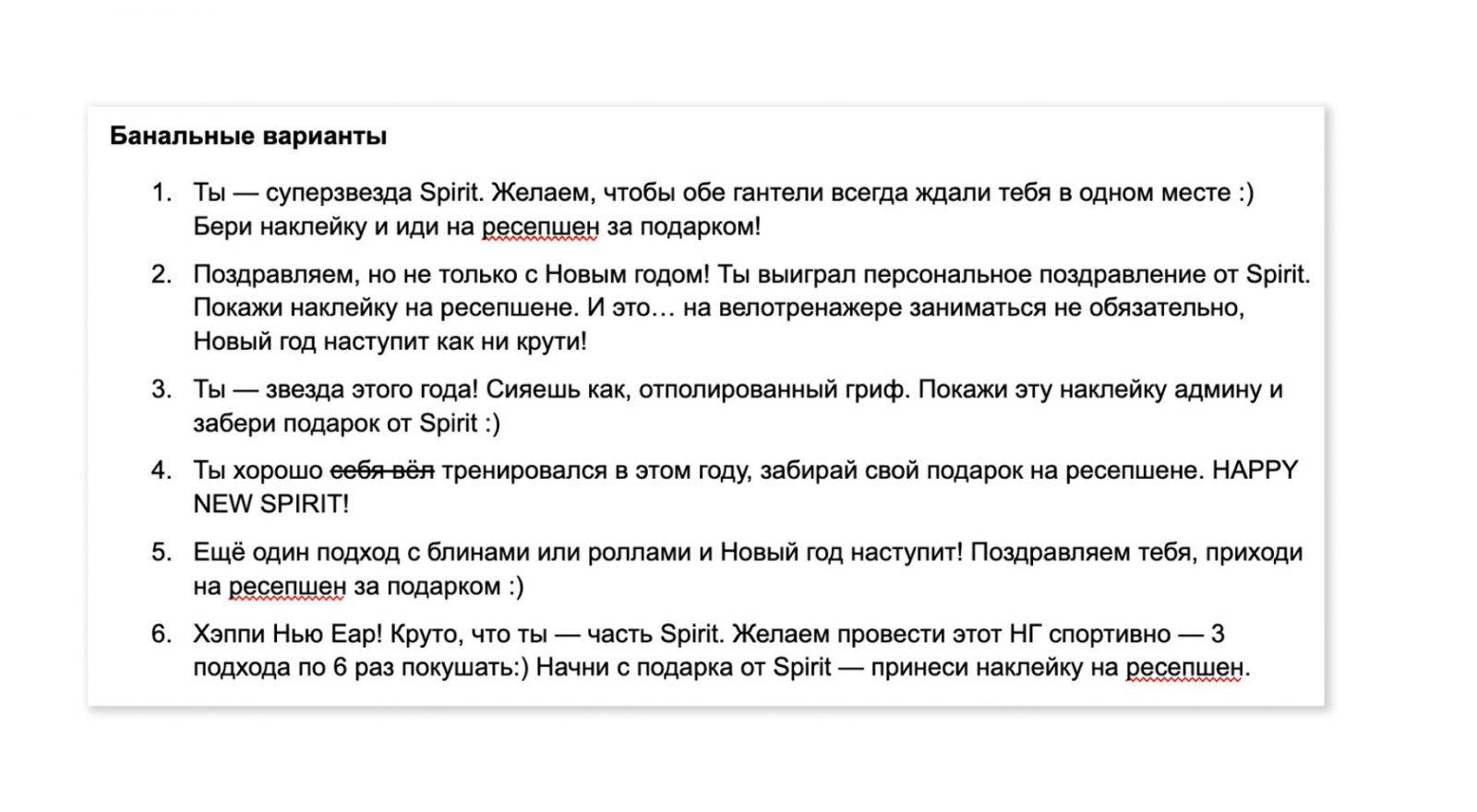 Spirit. Fitness постоянно придумывает челленджи, конкурсы и другие приятности для своих членов клуба, а мы придумываем как весело претворить это жизнь. Для Спирита мы креативщики на аутсорсе — пишем сценарии к аудиороликам, придумываем названия мероприятий, пишем email-письма, креативим на пиццах, футболках и в самих клубах. И всё это примерно в 2700 км от них, если верить Гуглу. Прошедший декабрь тоже не обошёлся без креативной задачки.
