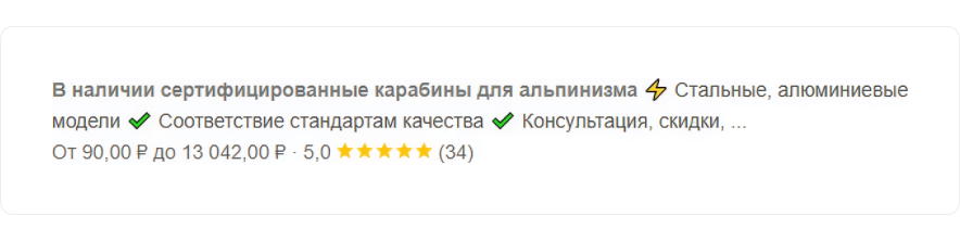 Пример из практики — интернет-магазин снаряжения для альпинизма. После корректировки заголовков, добавления релевантных ключевых слов, цен и рейтингов, сниппеты стали заметнее. В результате средний CTR увеличился в 2–3 раза, а объем продаж вырос вдвое.