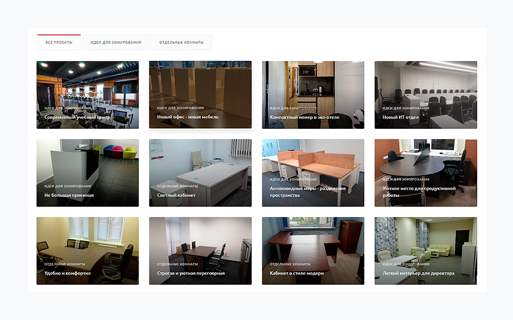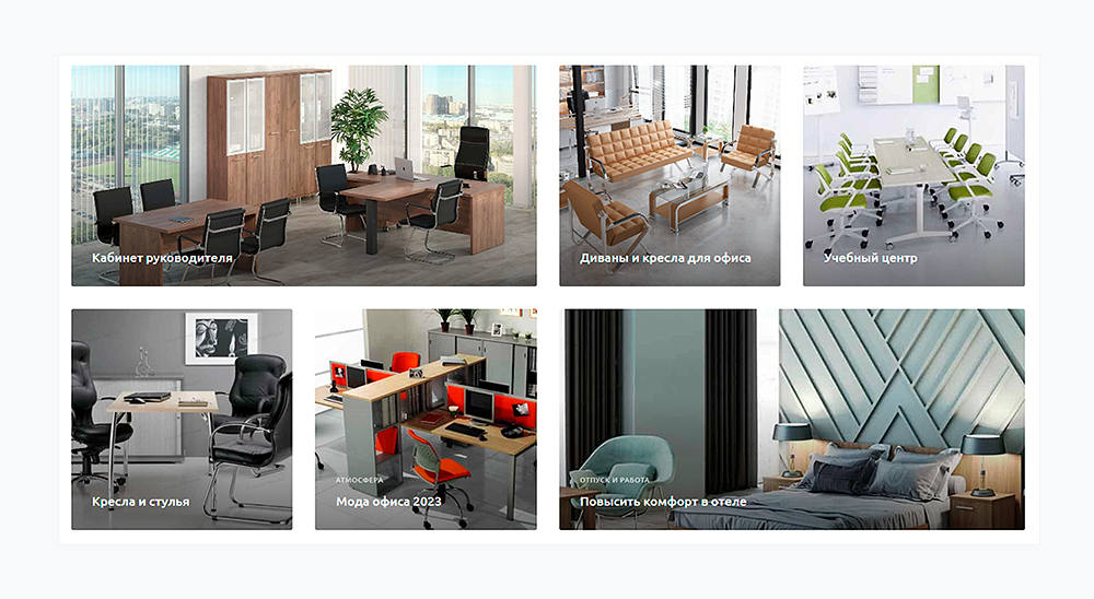В следующем блоке пользователи изучают варианты обустройства под конкретные типы рабочих зон. Это позволяет визуализировать будущий облик офиса перед выбором конкретных предметов мебели.