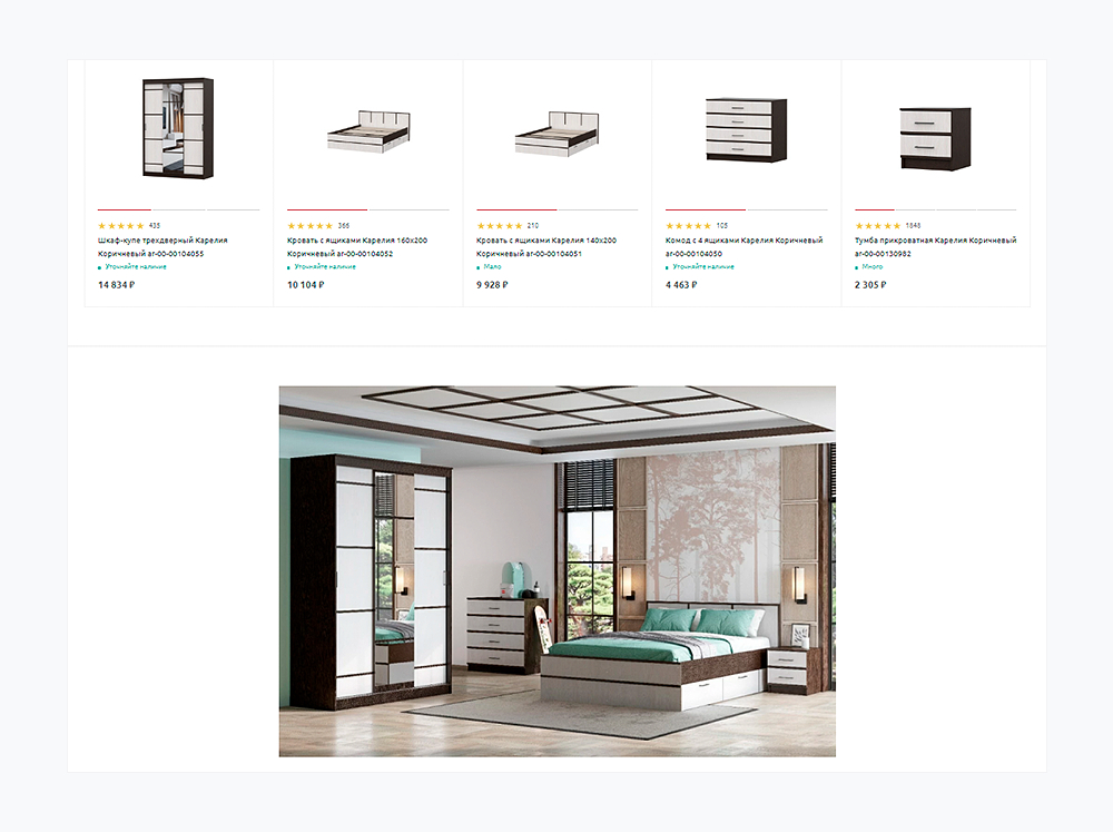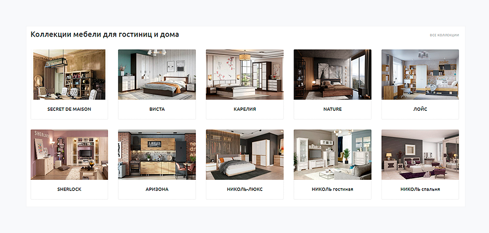 Коллекции на стартовой странице помогают отбирать мебель по определенной стилистике. Через такие подборки клиенты находят гармонично сочетающиеся элементы интерьера.