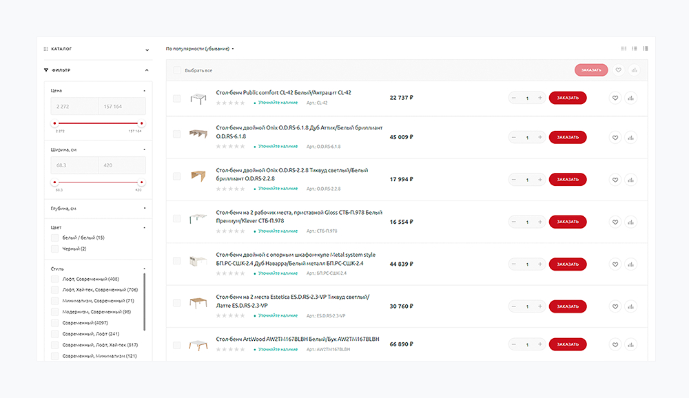 - Сортировка по востребованности, названию, стоимости и доступности на складе