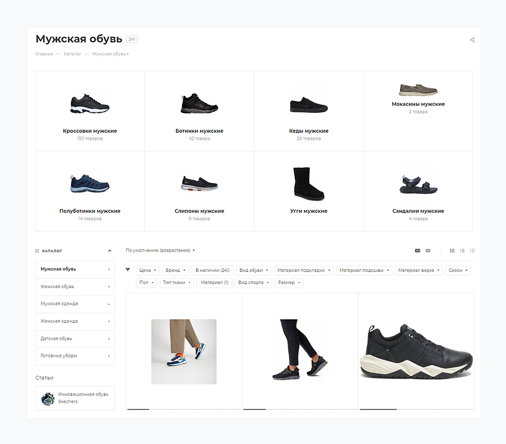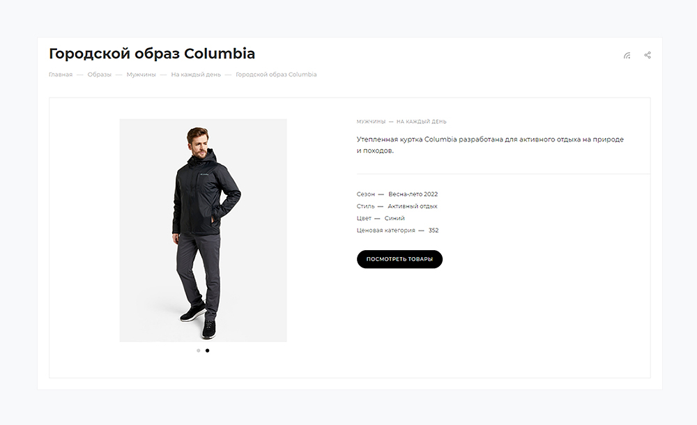 Разделы «Образы» и «Коллекции» способствуют росту среднего чека через cross-selling. Покупателю предлагаются готовые комплекты, включающие обувь, одежду и аксессуары.