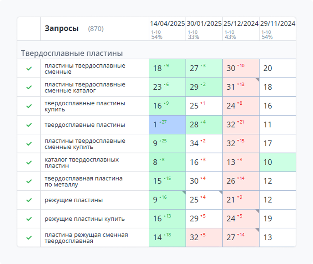 Формирование релевантного семантического ядра стало основой для дальнейшей оптимизации всех текстовых материалов. Для отслеживания динамики позиций настроили мониторинг в сервисе Topvisor.