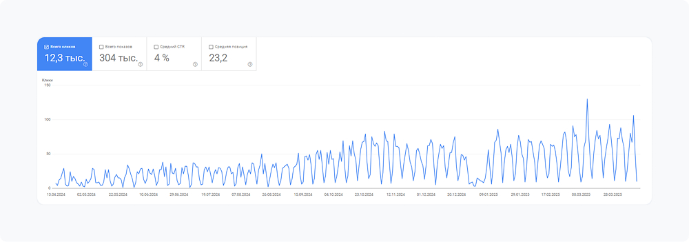 По данным Google Search Console наблюдается стабильный рост кликабельности. Ежедневное количество переходов увеличилось с 40 до 100, что подтверждает эффективность работы с метатегами и микроразметкой.
