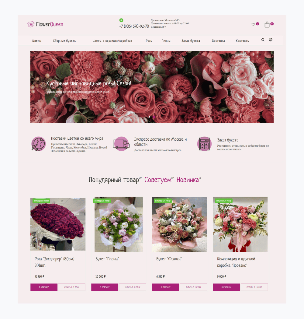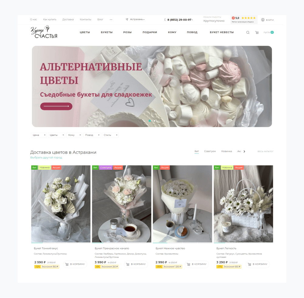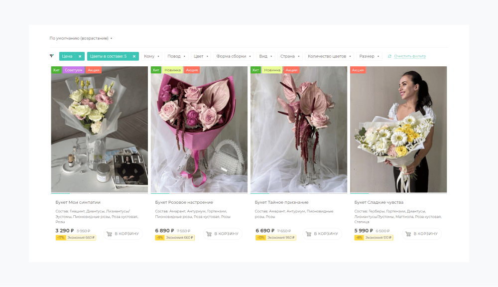 Организуйте товары по логичным категориям — «Букеты и композиции», «Монобукеты», «Сборные букеты». Обязательно настройте систему фильтрации по цене, виду цветов, размеру композиции.