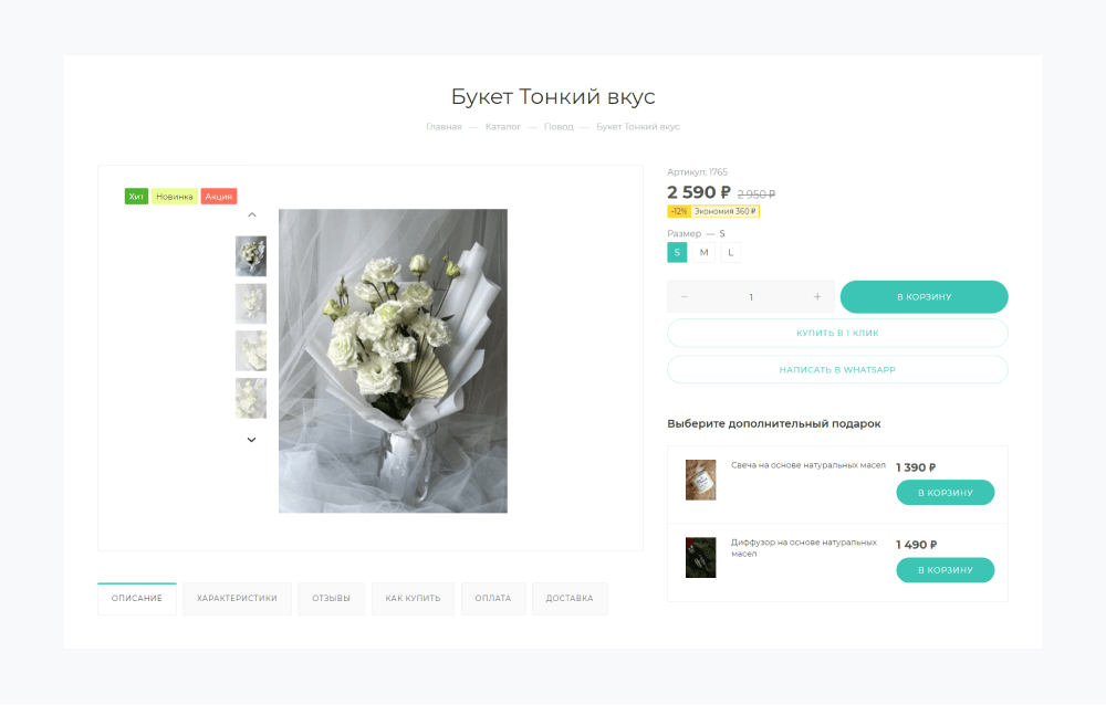Включите фотографии с разных ракурсов, подробные характеристики, условия доставки и оплаты. Добавьте блок сопутствующих товаров для увеличения среднего чека и настройте торговые предложения для выбора размера букета.