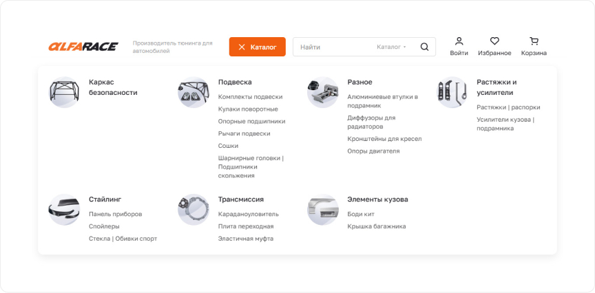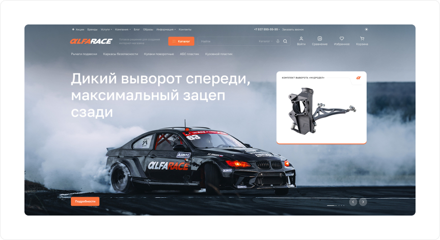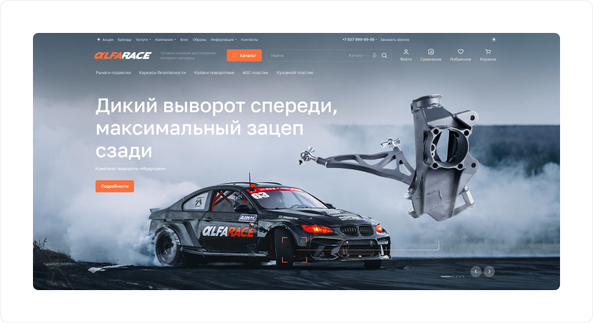 Изначально мы предложили классический подход — разместили деталь в белом квадрате рядом с гоночным автомобилем. Такое решение позволяло легко менять товары без серьезных затрат на дизайн.