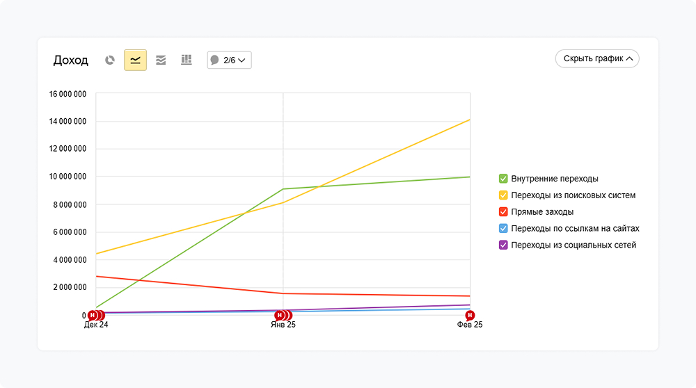 Согласно данным аналитики, выручка от поисковых переходов демонстрировала устойчивый рост, поднявшись с 4 миллионов до 14 миллионов рублей.