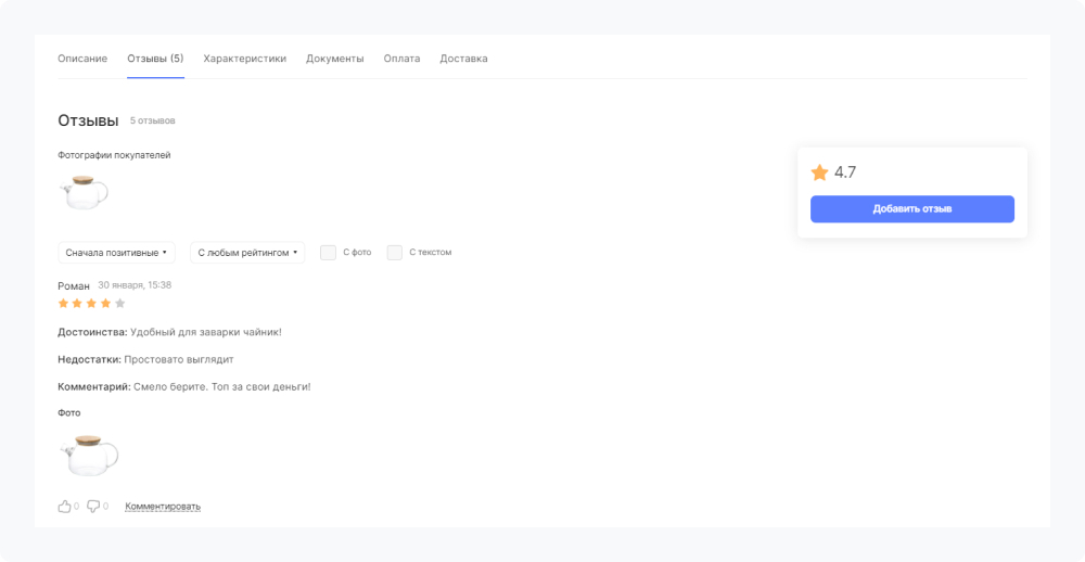 Мнения других потребителей играют важную роль при принятии решения о покупке. Функционал рейтингов и отзывов решает эту задачу.