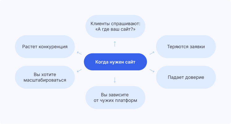 Если вы ведете бизнес через аккаунт в соцсетях или страницу на маркетплейсе, вы строите свой бизнес на чужой территории. В любой момент эти платформы могут поменять свои правила, заблокировать ваш аккаунт или повысить комиссии. Все, что вы построили, окажется под угрозой. Собственный сайт — это ваша собственная цифровая недвижимость, которая становится активом, на который вы имеете полный контроль. С ним вы сможете влиять на функционал, дизайн, клиентский опыт и данные.